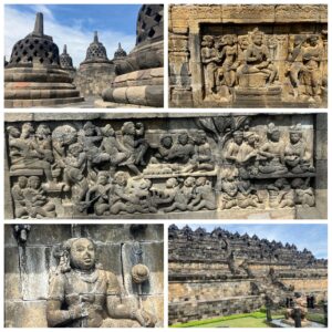 Standing before either monument, one cannot help but wonder at the sheer human effort behind them. Each structure required tens of thousands of stone blocks quarried from the surrounding volcanic landscape, transported, carved and set in place without mortar. Thousands of individually carved relief panels tell continuous narrative cycles, carrying moral and spiritual lessons that remain recognisable today. The work required immense organisation and logistics, coordinated across a vast labour force. Construction took place over at least three successive reigns—continuity on a scale difficult to imagine—drawing on thousands of skilled artisans, labourers and craftsmen. While there is no evidence of slavery, corvée labour (mandatory service owed to the ruler) was almost certainly used. These monuments represent an extraordinary level of cultural achievement: engineering, labour management and artistic vision working together to express an entire civilisation’s understanding of the cosmos in stone.
